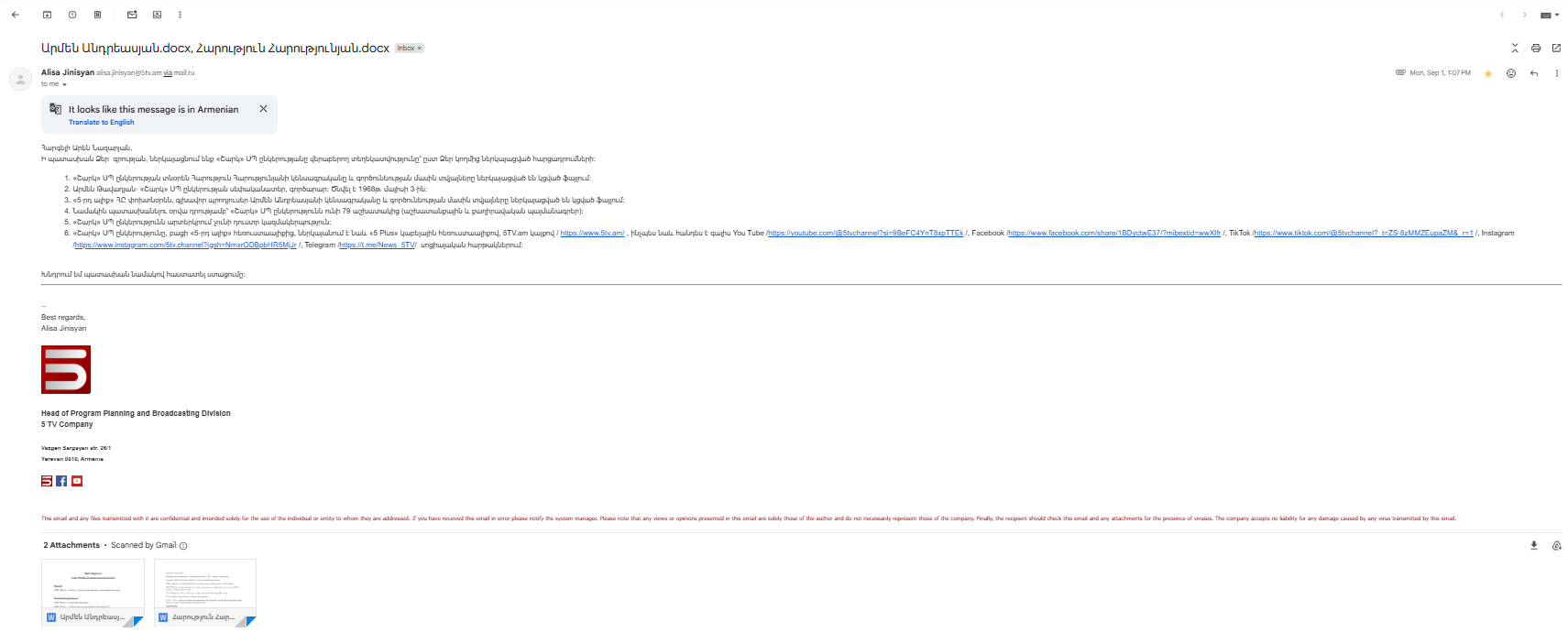 - MOM request to 5 TV (Armenian) Հայաստան · 2025Կազմակերպություն